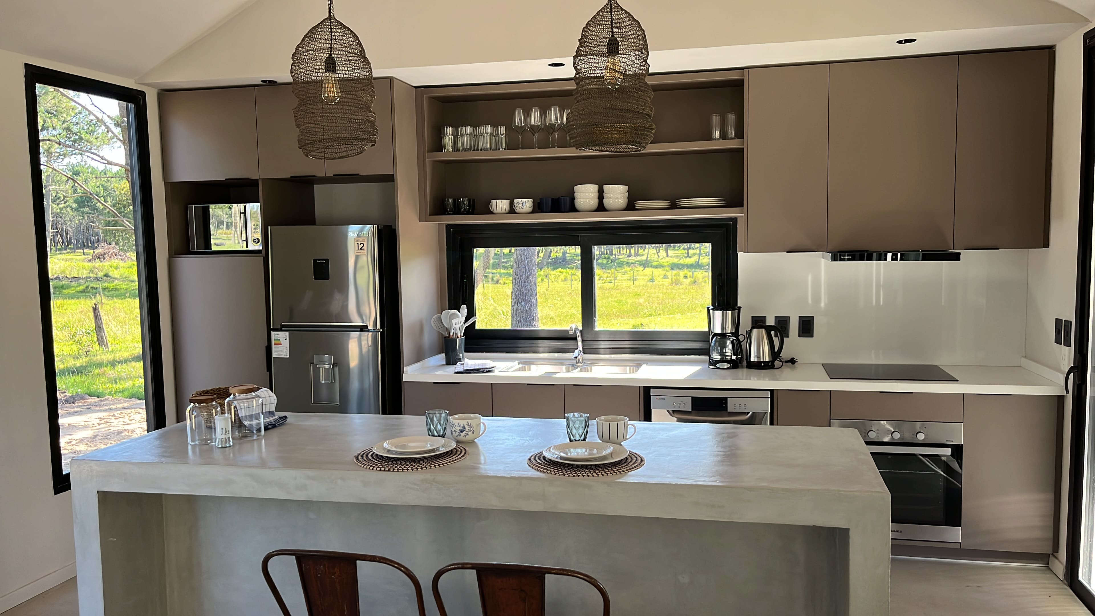 El interior cuenta con un living-comedor amplio con estufa a leña tradicional y cocina integrada completamente equipada.